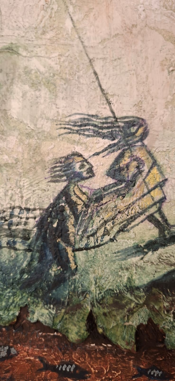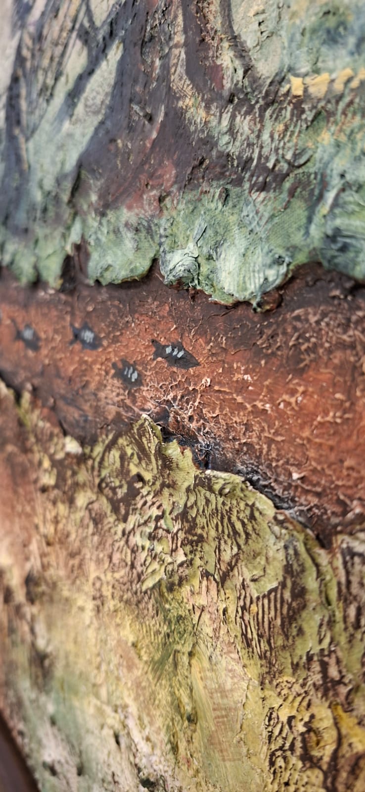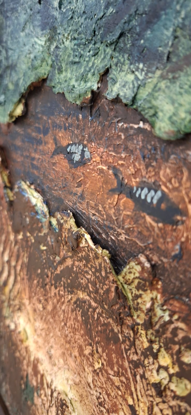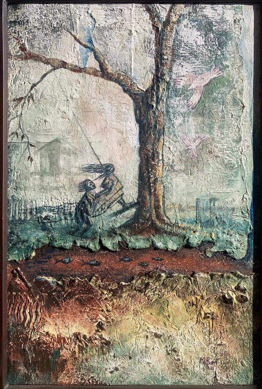 This composition bifurcates into two realms: an upper world of movement and liberty, and a lower world submerged in the depths of soil and memory. The tree acts as a visceral bridge between earth and sky, while the calculated use of raw materials enhances the “geological” feel of the canvas, presenting it as a fragmented piece of the earth itself.