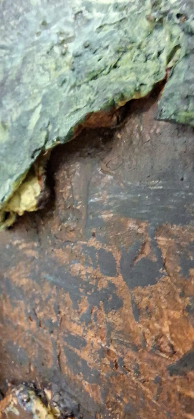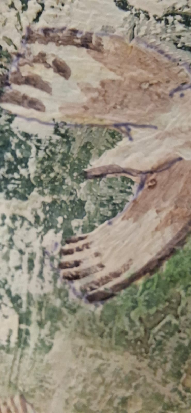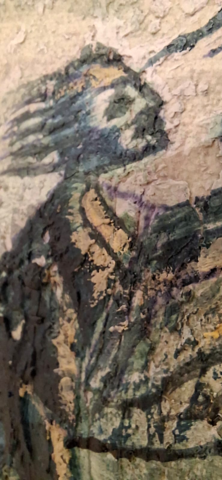 This composition bifurcates into two realms: an upper world of movement and liberty, and a lower world submerged in the depths of soil and memory. The tree acts as a visceral bridge between earth and sky, while the calculated use of raw materials enhances the “geological” feel of the canvas, presenting it as a fragmented piece of the earth itself.