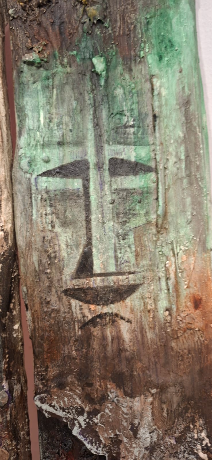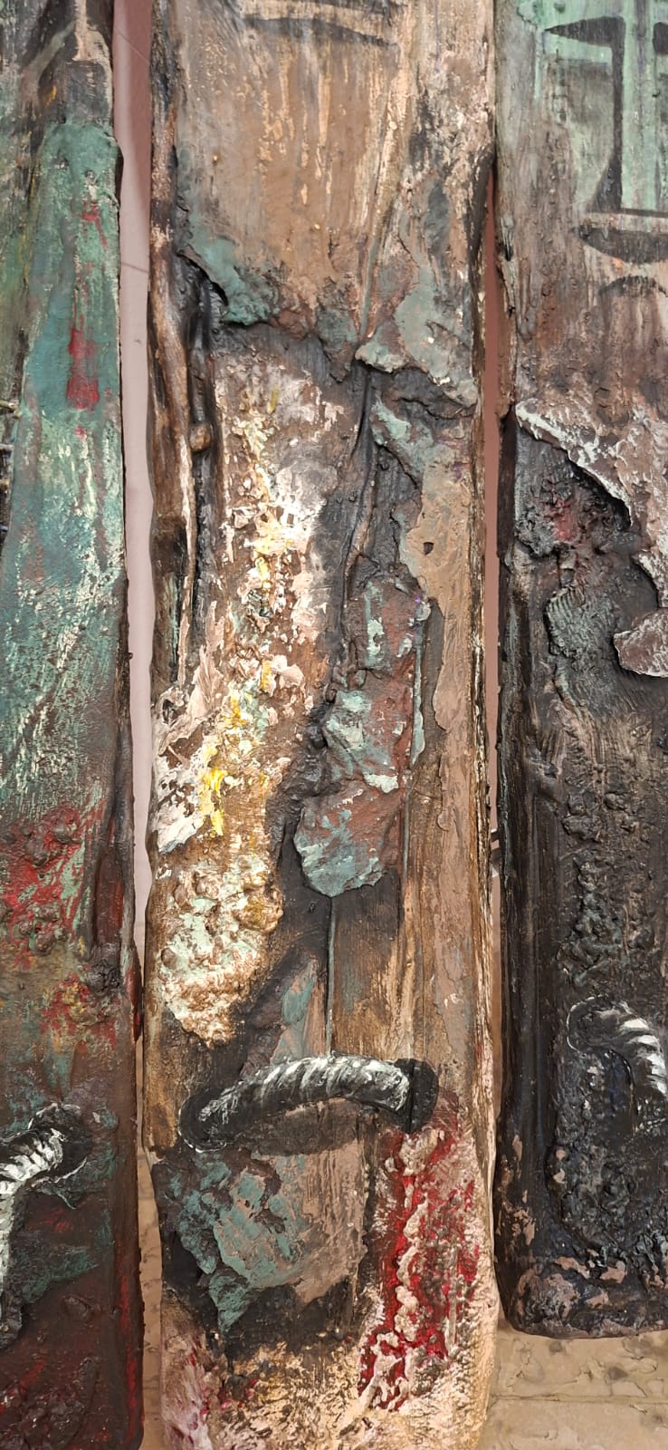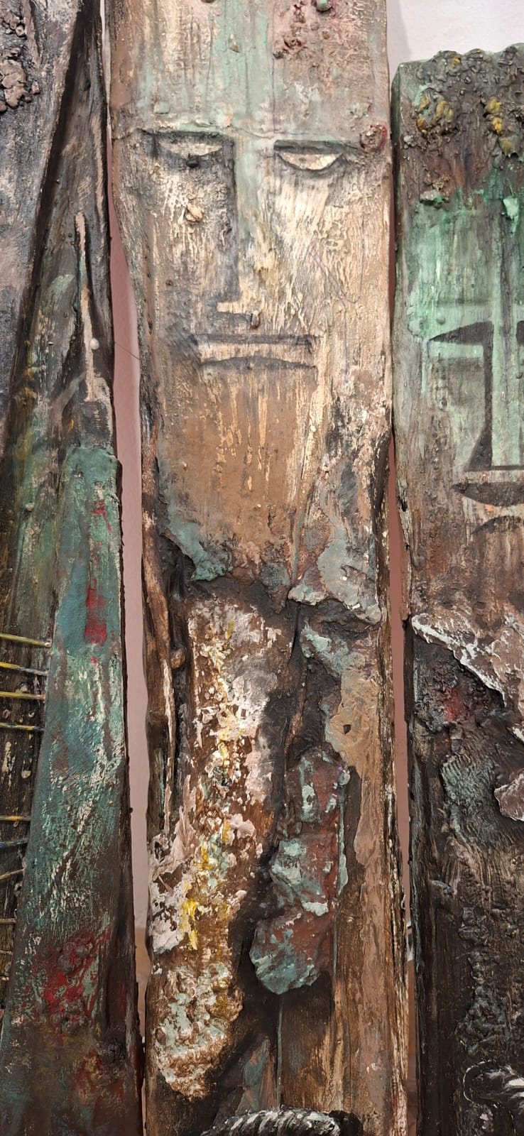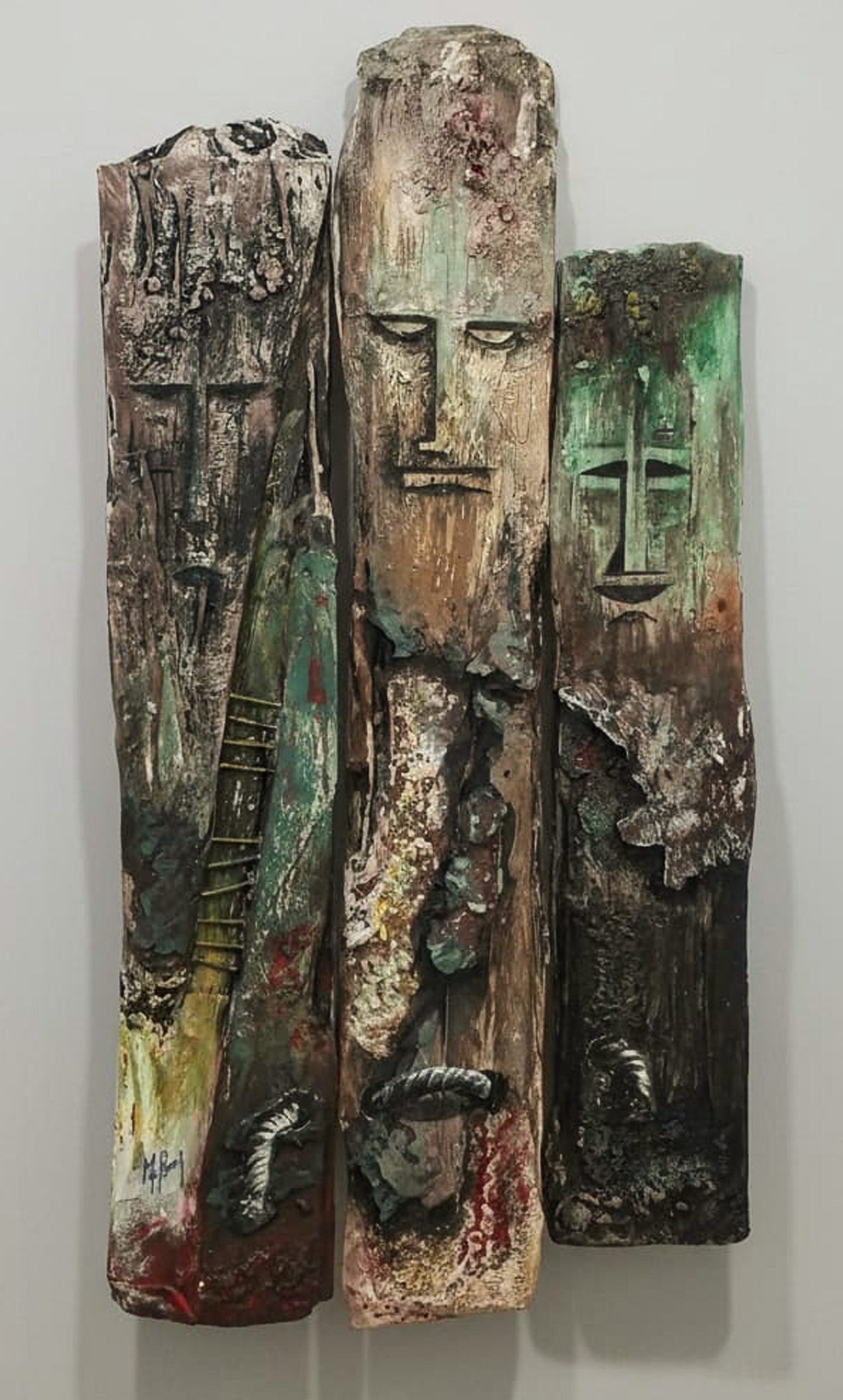 Three vertical sentinels carved from the memory of wood. Their elongated, stoic features resemble ancient totems standing guard over a forgotten time. The textured, eroded surfaces and the rusted handles suggest they have weathered centuries, remaining steadfast in their silent watch.
