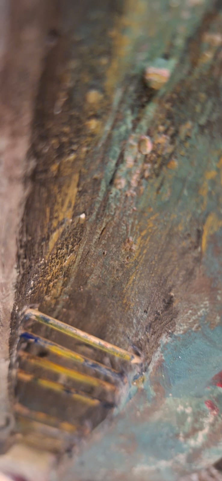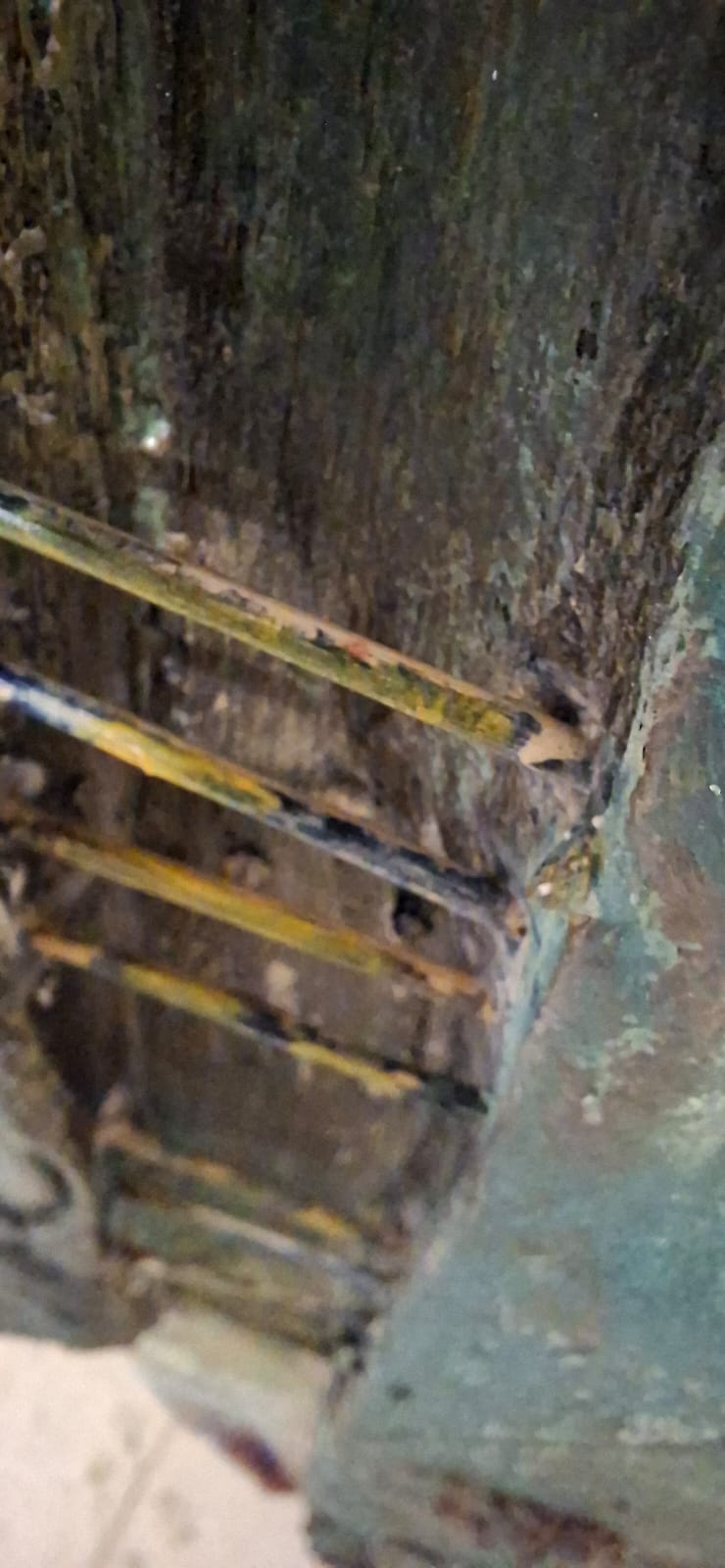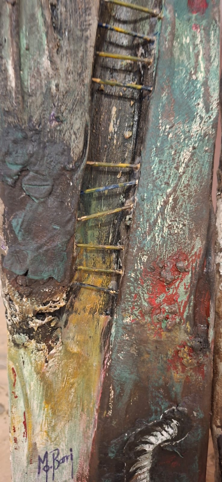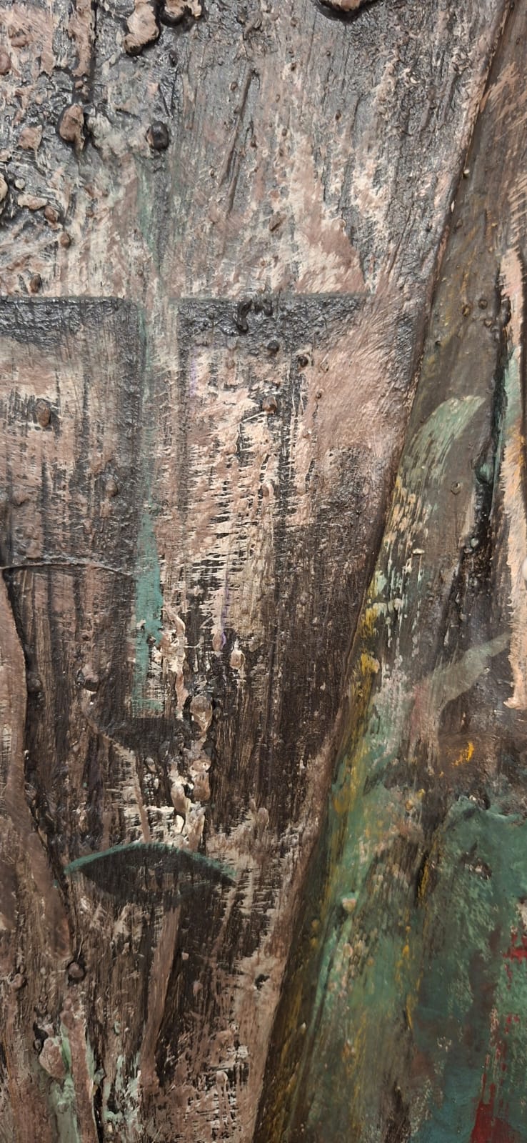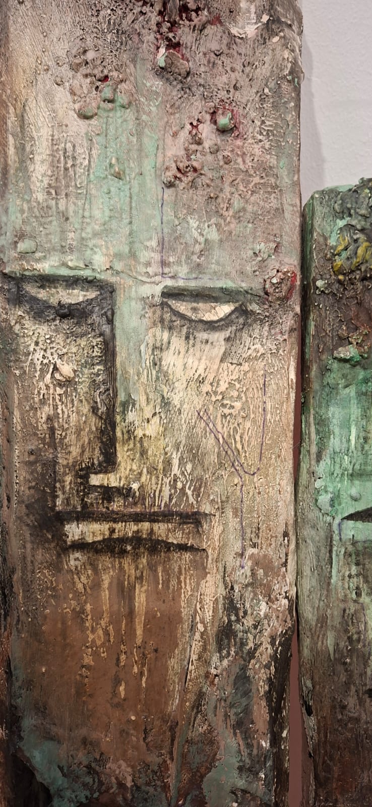 Three vertical sentinels carved from the memory of wood. Their elongated, stoic features resemble ancient totems standing guard over a forgotten time. The textured, eroded surfaces and the rusted handles suggest they have weathered centuries, remaining steadfast in their silent watch.